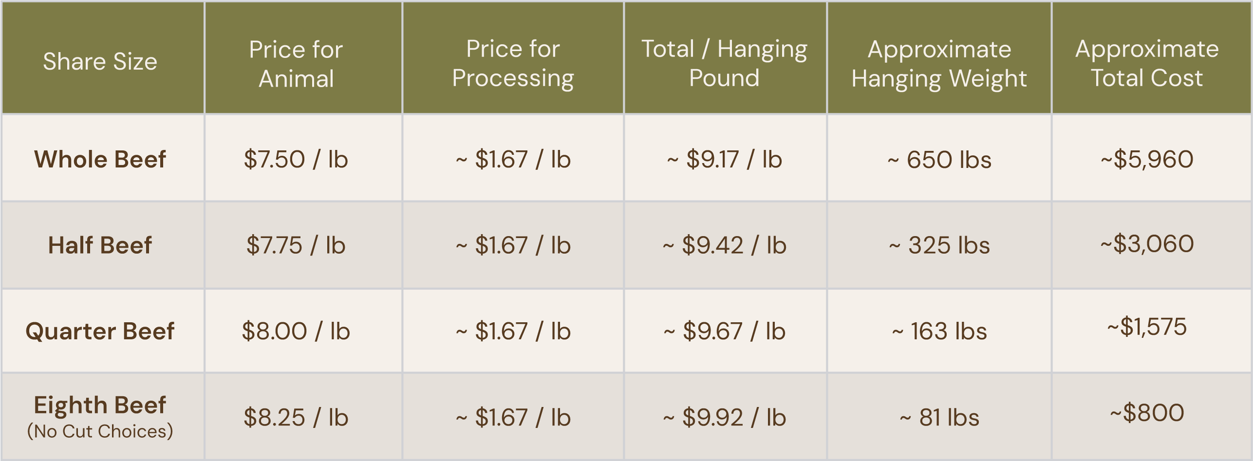 Processing is scheduled to take place in October. A cut sheet with explanations for all available cut choices will be sent to you around August 1st . The price to process your animal will vary based on your cut selections, but $1.67 / per hanging pound is the average price.