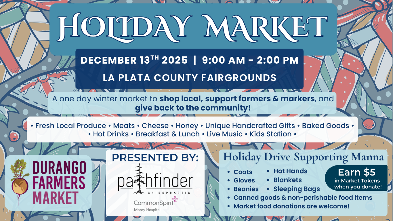 Join us on December 13 from 9 AM to 2 PM at the La Plata County Fairgrounds to celebrate the season and support our local community. We’ll be at the Leaning Tree Farms booth, surrounded by incredible local vendors, festive food, and live music. Don’t forget to bring coats, gloves, blankets, or canned goods for the Holiday Drive supporting Manna — you’ll even earn market tokens for your donation. Come shop local and spread a little holiday cheer with us!